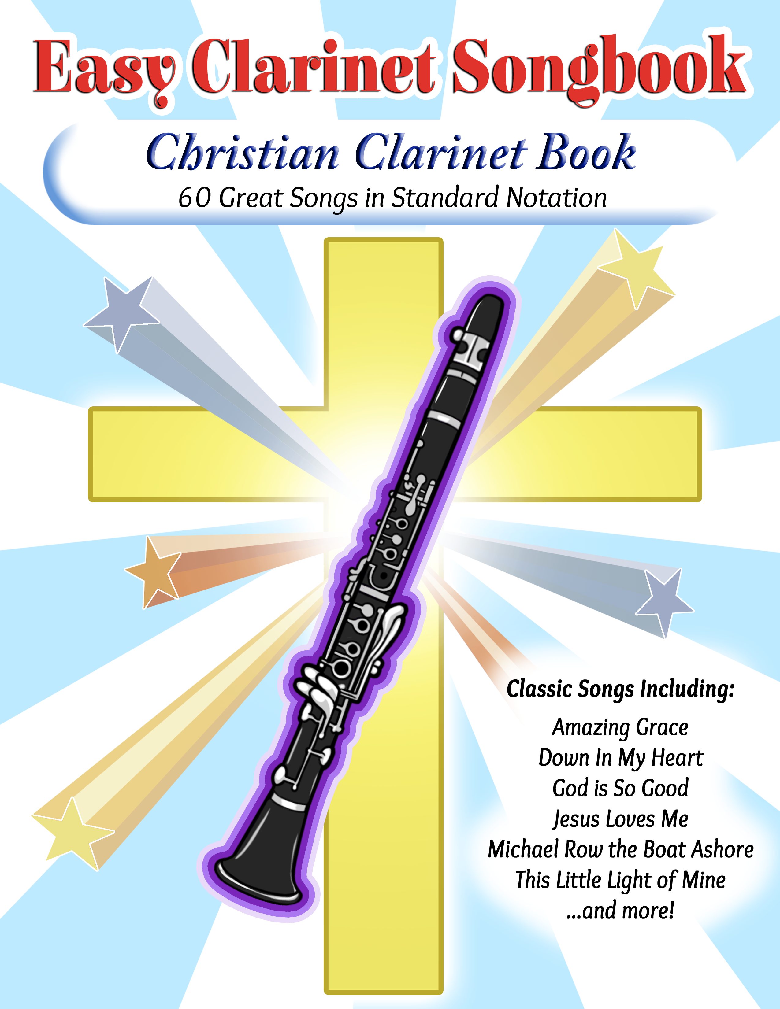 Easy Clarinet Songbook for Christians, children, and beginners, printed in standard notation. This 120-page clarinet book features sheet music for 60 classic Christian songs. Songs are scored in the best keys for the clarinet, providing easy and consistent fingerings for every single song.