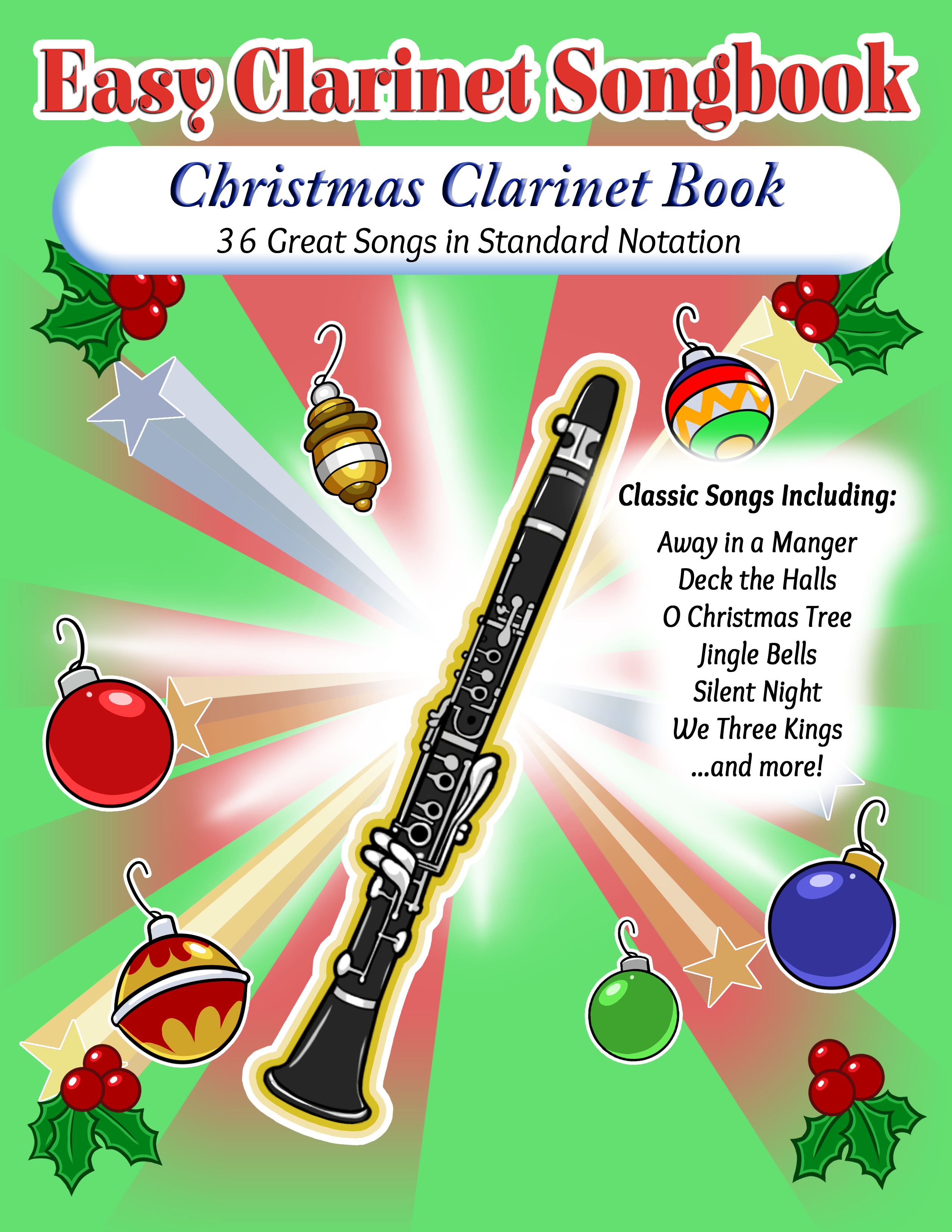 Easy Clarinet Songbook perfect for beginners, printed in standard notation. This 75-page clarinet book features sheet music for 36 classic Christmas songs. Songs are scored in the best keys for the clarinet, providing easy and consistent fingerings for every single song.