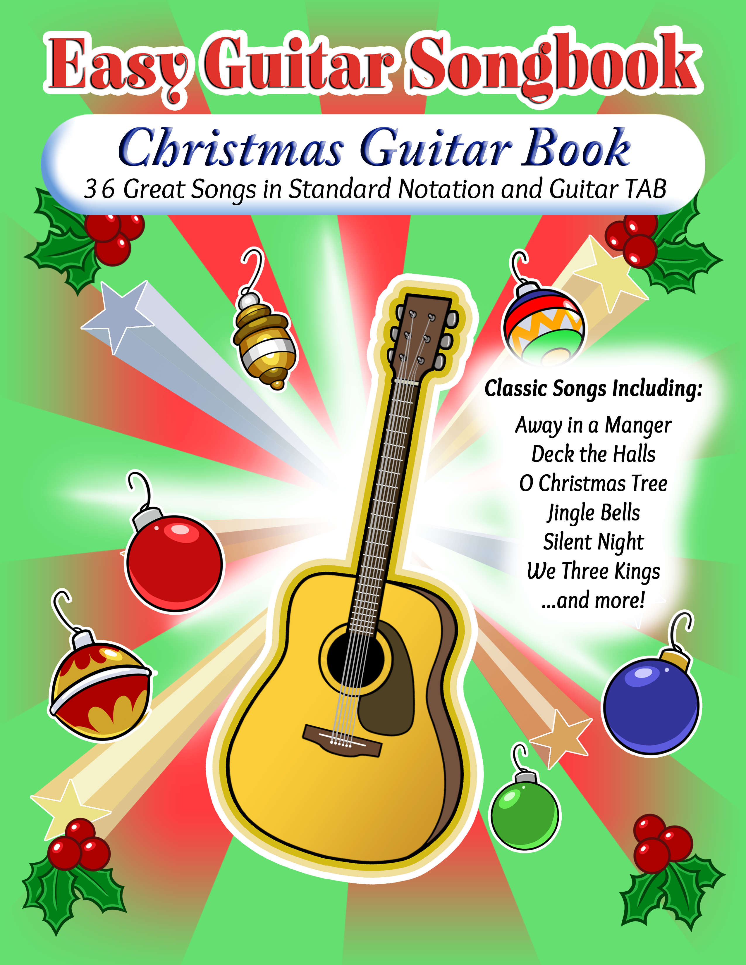 Easy Guitar Songbook perfect for beginners, printed in standard notation and Guitar Tablature. This 80-page guitar book features sheet music for 36 classic Christmas holiday songs. Songs are scored in the best keys for the guitar, providing easy and consistent fingerings for every single song. Chord fingering diagrams and strumming patterns are also provided.